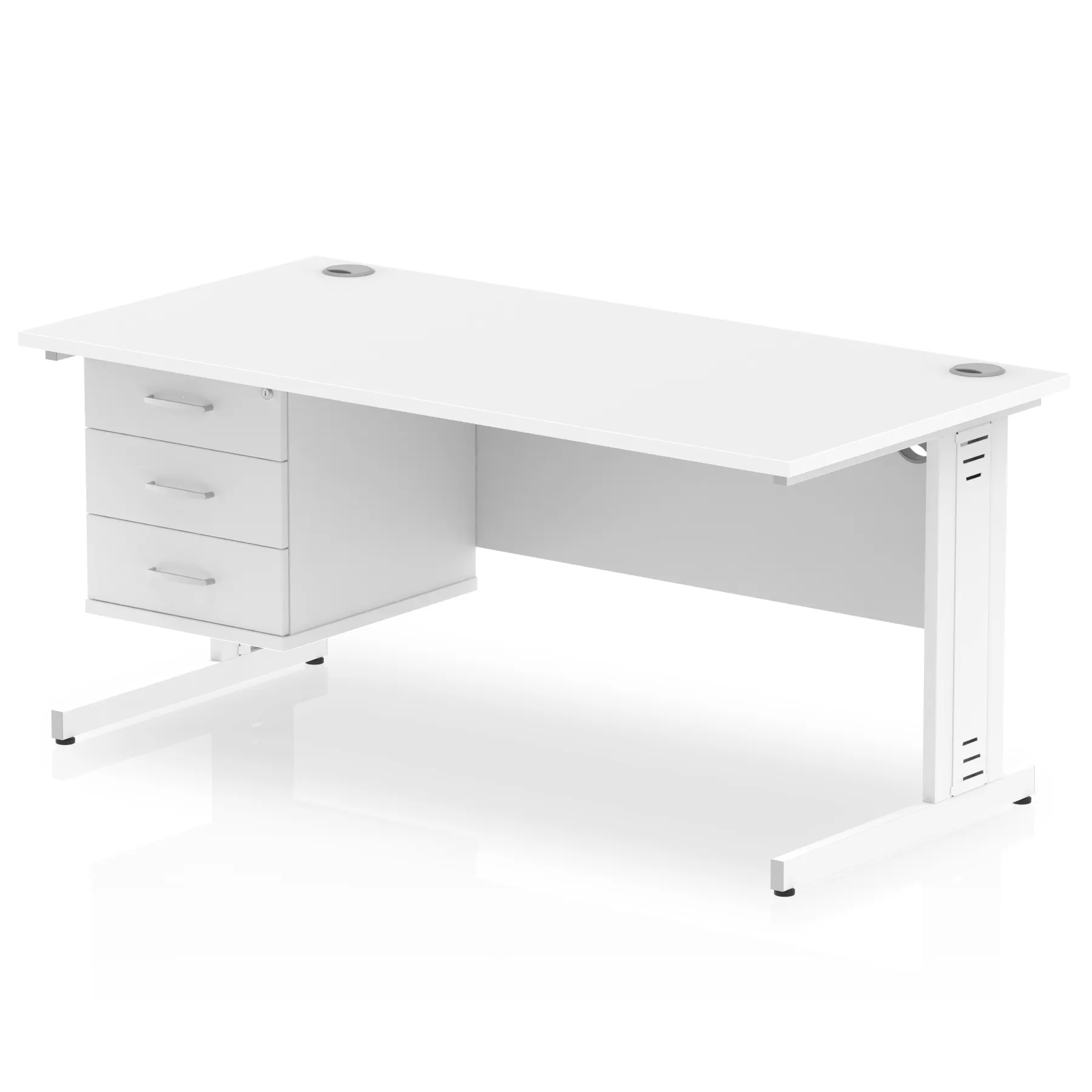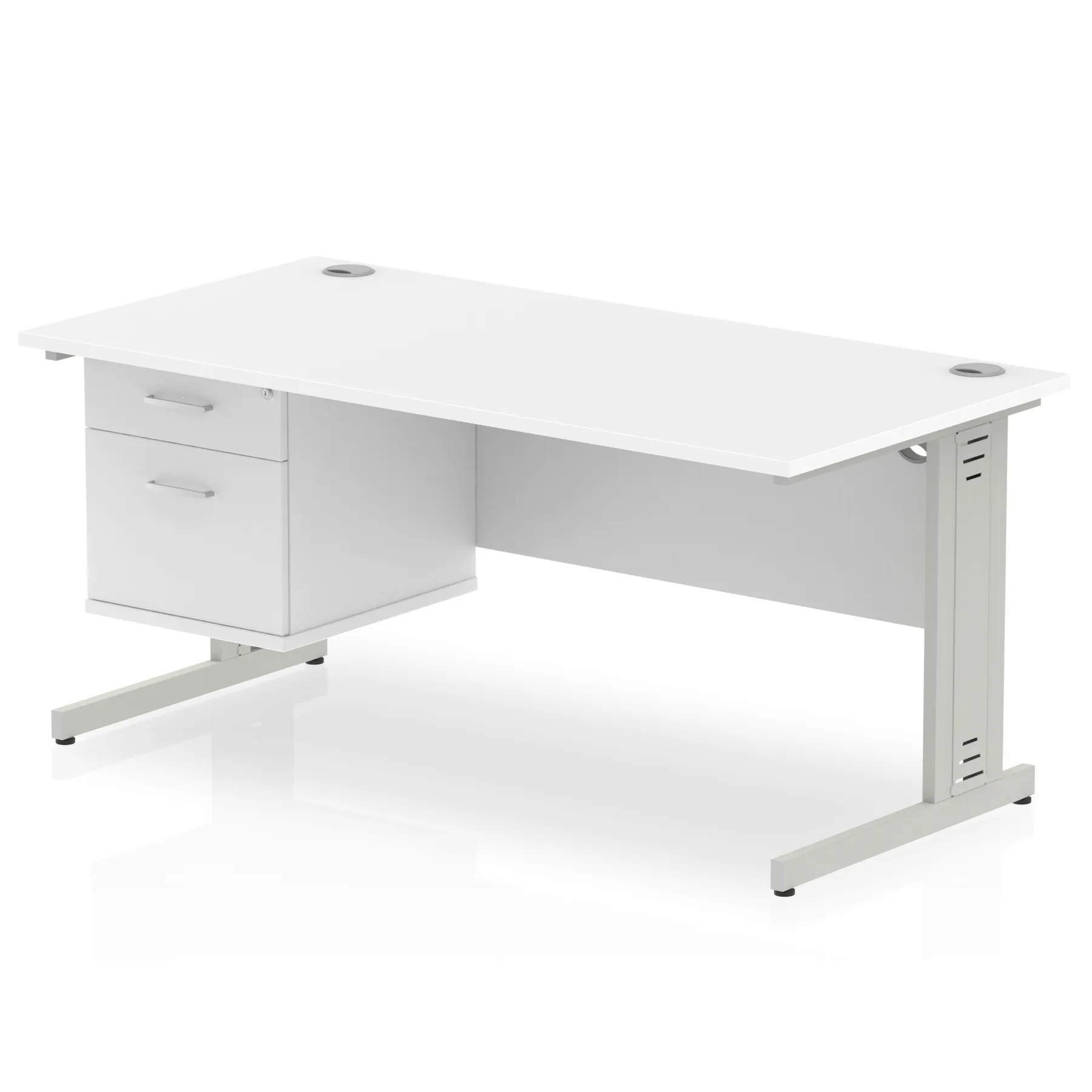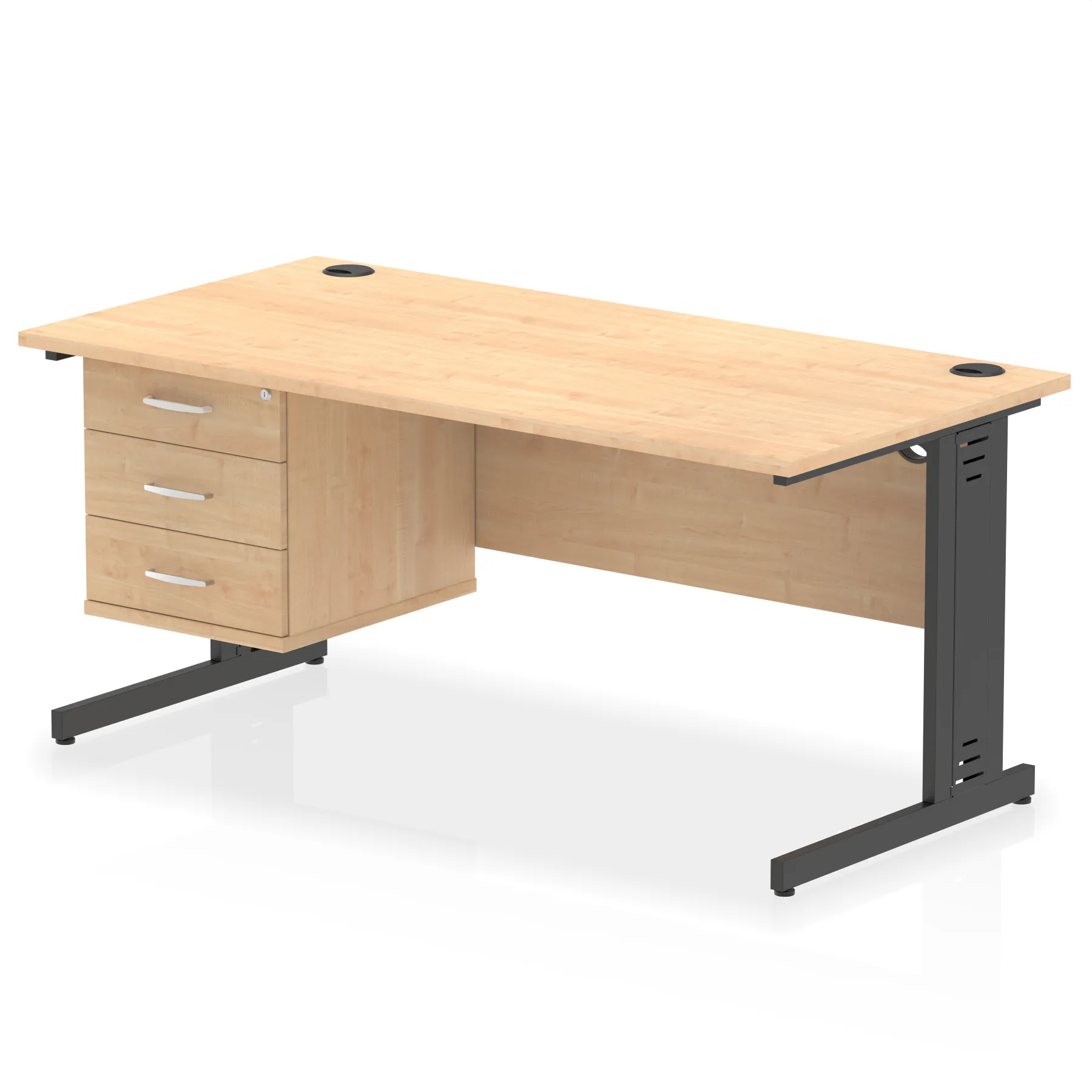 • Impulse contract 1600 wide desk • 25mm tops • Wire management panel • Heat resistant beech melamine finish • 18mm modesty panel • 2mm protective abs edging • Silver coated double strut legs • 2 cable ports • Height adjustable feet • Steel to steel fixings • 2 modesty panel slots • Deep set modesty panel (5”) allows for compatibility of most screen clamp fittings • Fixed pedestal