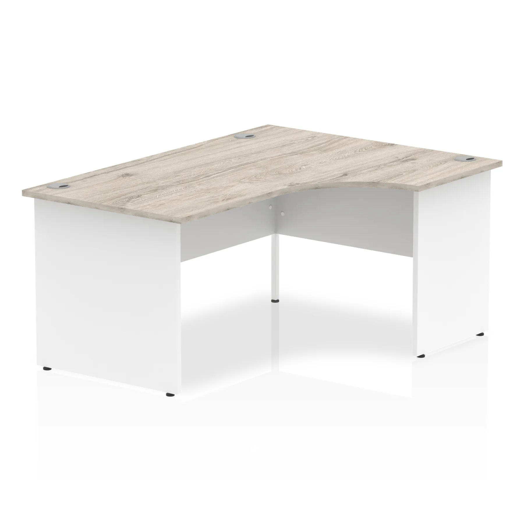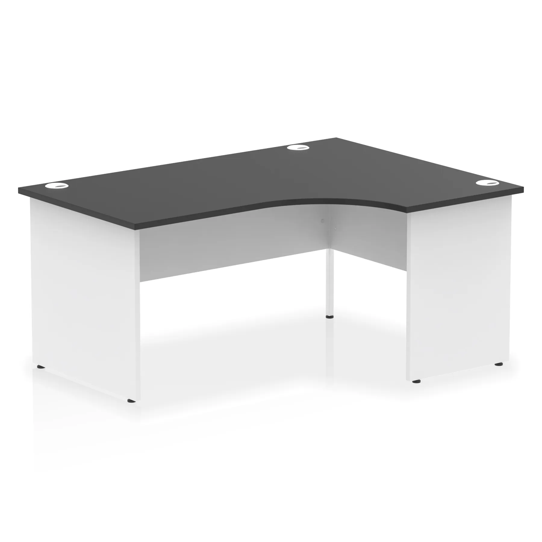 Impulse contract 1600 wide crescent desk | 25mm tops | Heat resistant beech melamine finish | 18mm modesty panel | 2mm protective abs edging | Matching wood panel end legs | 3 cable ports | Height adjustable feet | Steel to steel fixings | 3 modesty panel slots | 600 deep | Deep set modesty panel (5″) allows for compatibility of most screen clamp fittings | Weight Capacity 135Kg
