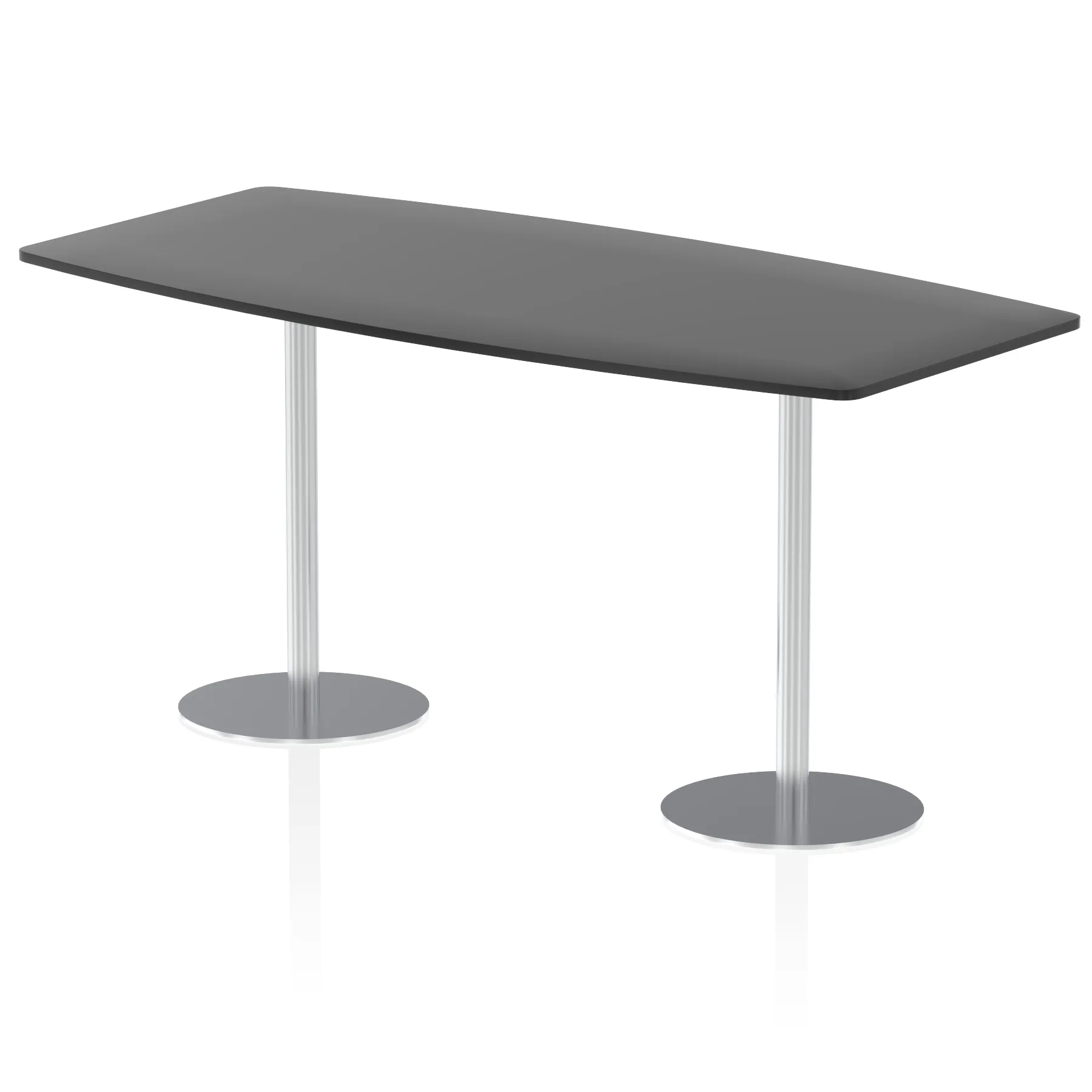 25mm thick desk top profile | Dual, brushed stainless steel effect circular base (580mm diameter) | Brushed stainless steel pillars (76mm diameter) | Weighted base provides stability | Writable desk surface