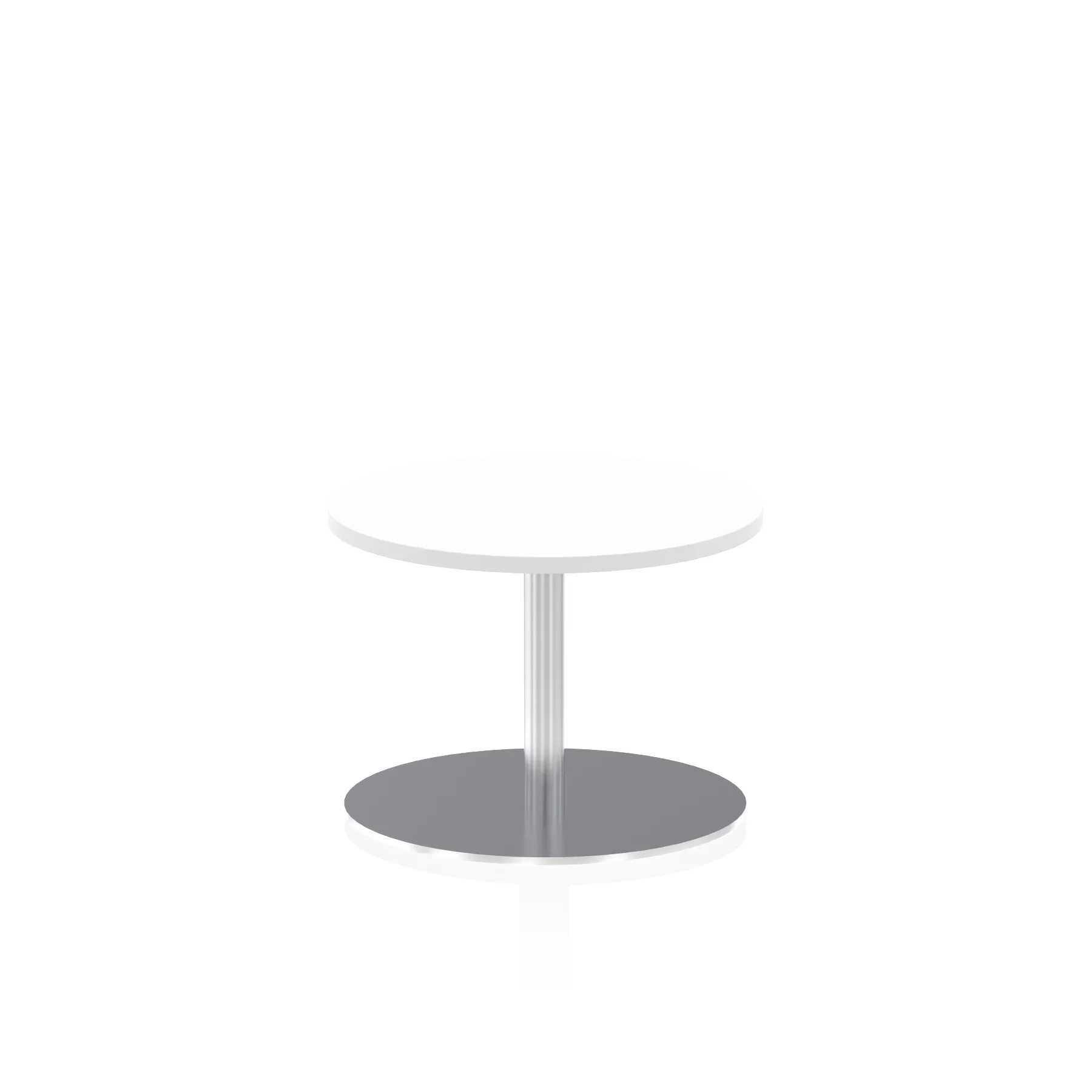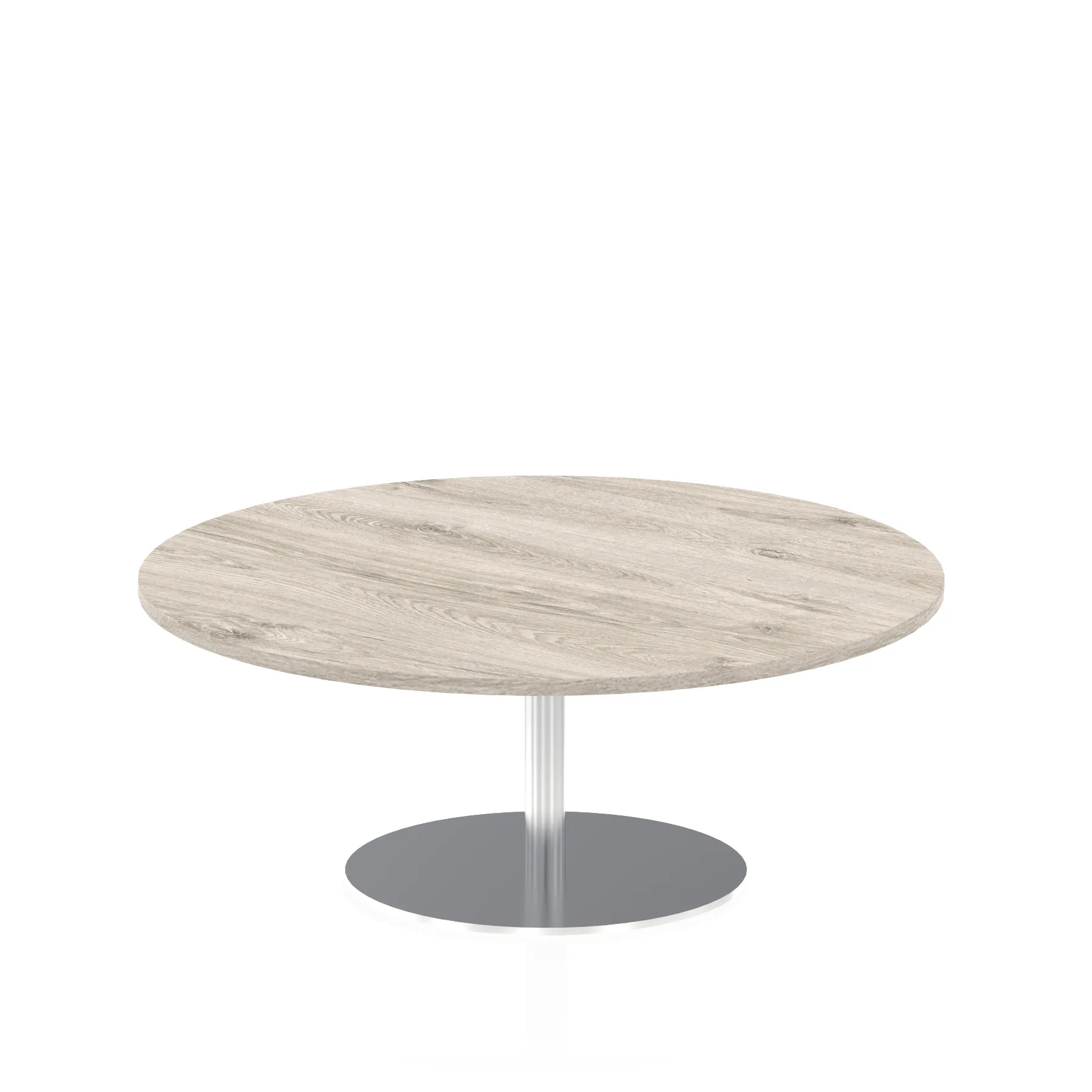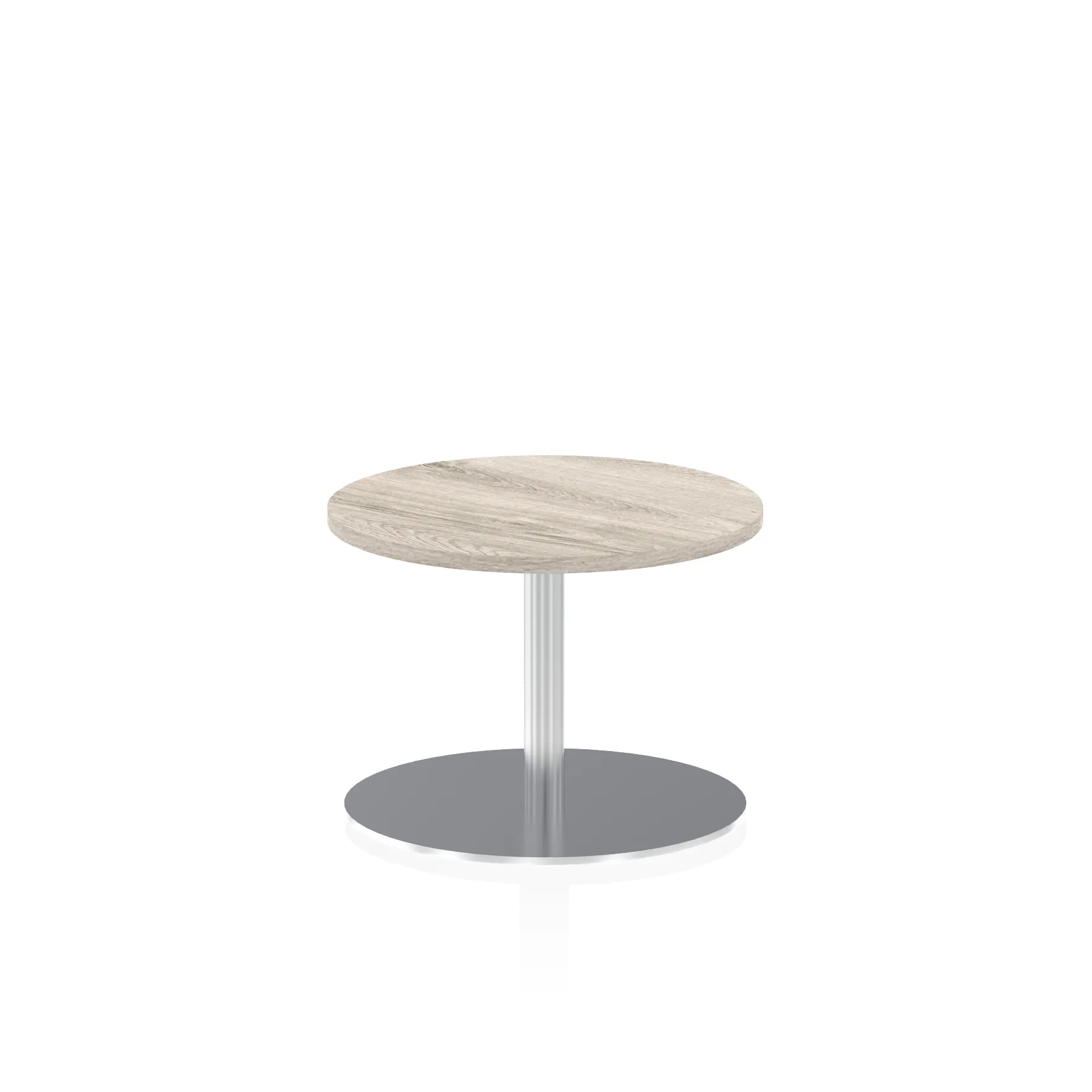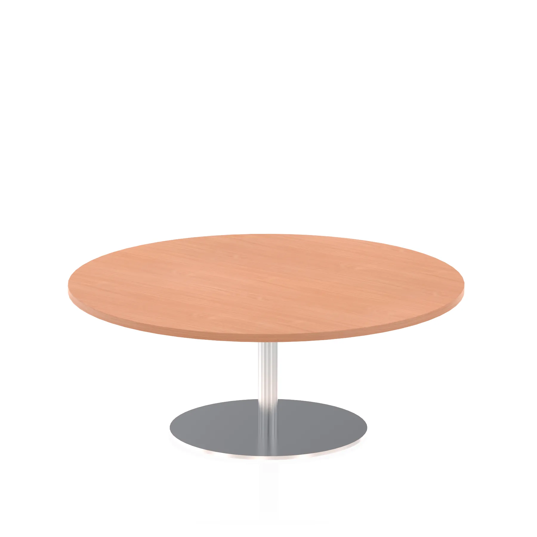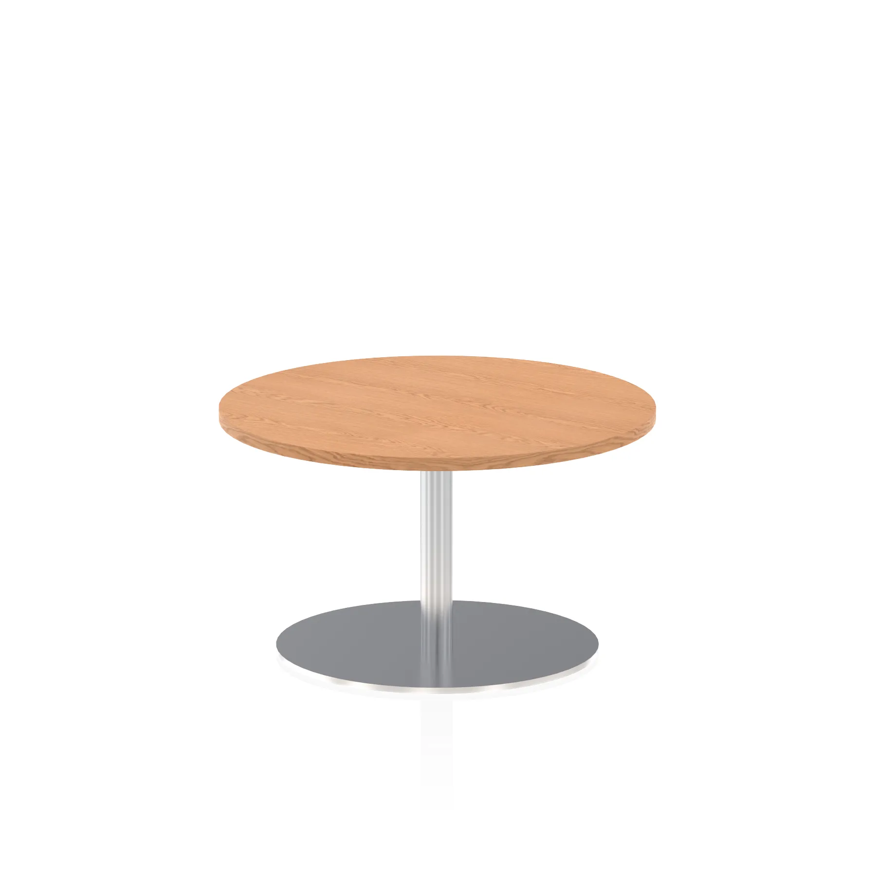 25mm thick desk top profile | Brushed stainless steel effect circular base (580mm diameter) | Brushed stainless steel pillars (76mm diameter) | Weighted base provides stability | Two part bolted frame system