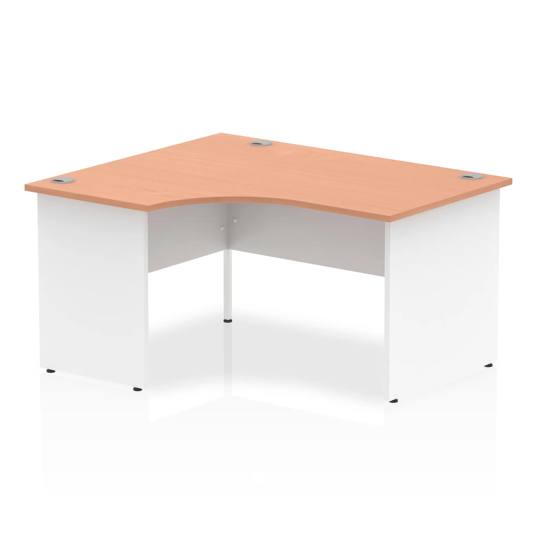 Impulse contract 1400 wide crescent desk | 25mm tops | Heat resistant beech melamine finish | 18mm modesty panel | 2mm protective abs edging | Matching wood panel end legs | 3 cable ports | Height adjustable feet | Steel to steel fixings | 3 modesty panel slots | 600 deep | Deep set modesty panel (5″) allows for compatibility of most screen clamp fittings | Weight Capacity 135Kg