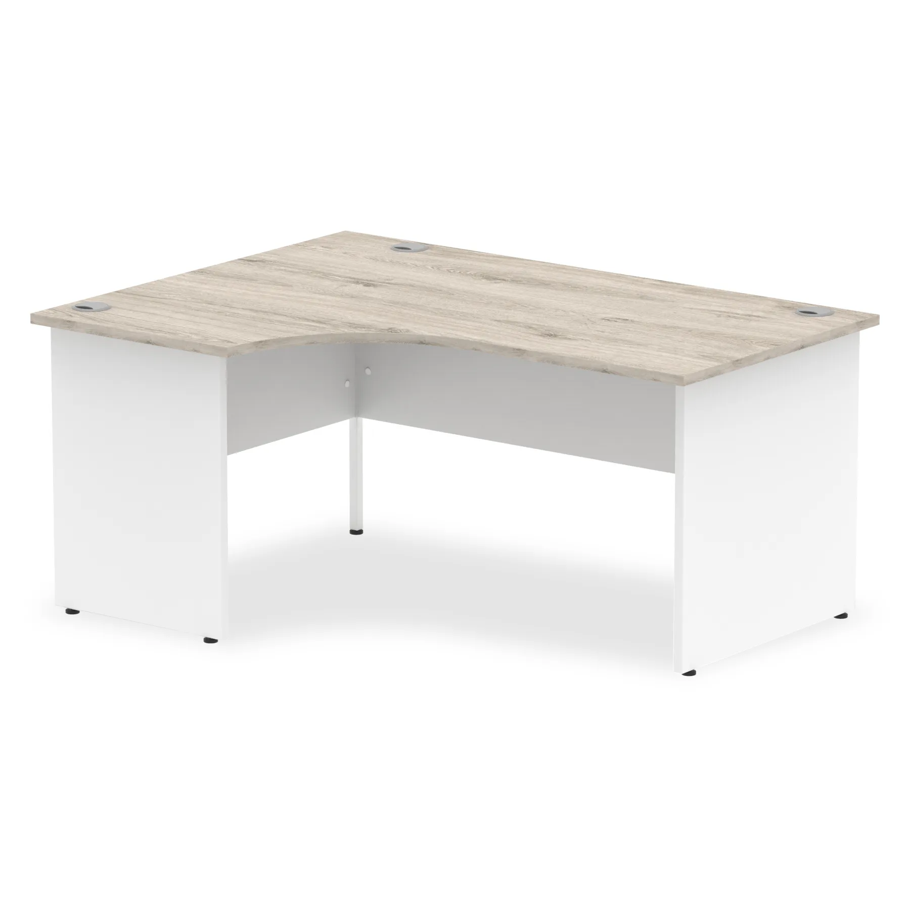 Impulse contract 1600 wide crescent desk | 25mm tops | Heat resistant beech melamine finish | 18mm modesty panel | 2mm protective abs edging | Matching wood panel end legs | 3 cable ports | Height adjustable feet | Steel to steel fixings | 3 modesty panel slots | 600 deep | Deep set modesty panel (5″) allows for compatibility of most screen clamp fittings | Weight Capacity 135Kg